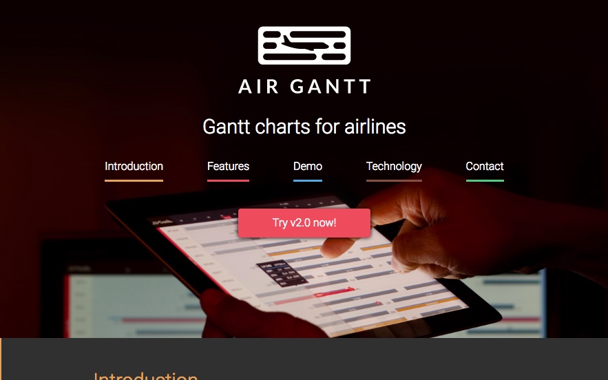 AirGantt is a single-page website with information about the AirGantt product. The idea is to convey the necessary information quickly while illustrating an important feature of the product (responsiveness) with a large background image.