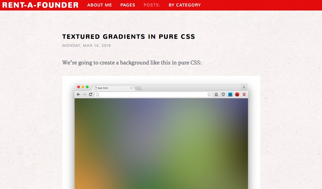 I’m keeping a personal blog at rentafounder.com with mostly technical content. It’s built using Hugo.