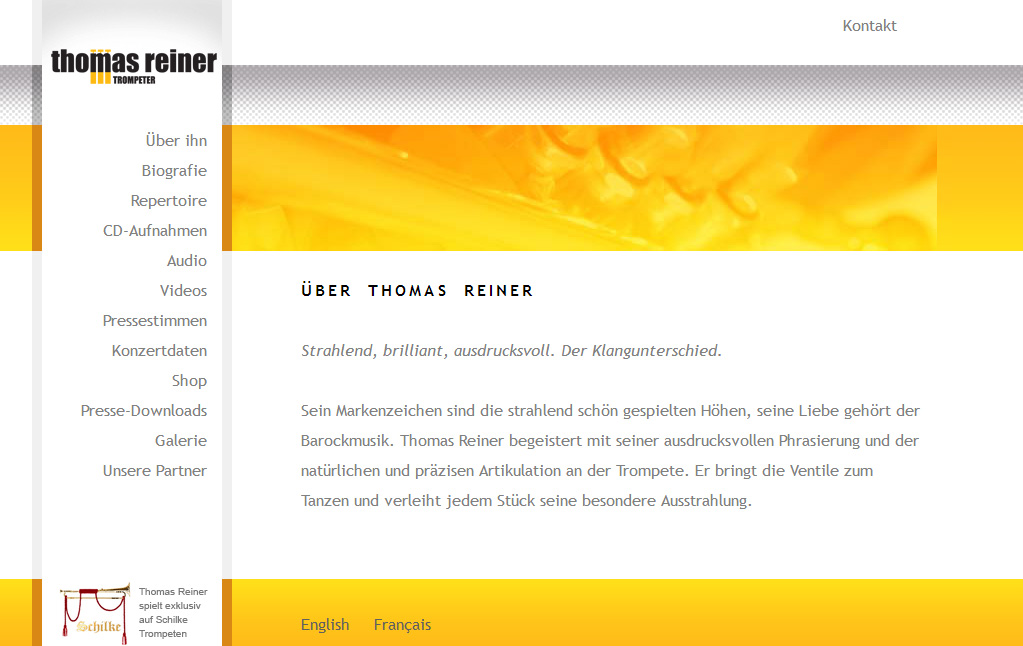 This is a website for trumpeter Thomas Reiner. What you see in this screenshot is already the third design incarnation of the page, and it is dated, too (it still uses Flash). The redesigns were also related to me changing the backend from a custom administration system to Wordpress to a custom solution again. I wanted the customer to be able to maintain the content themselves, to minimize my involvement. However, early versions of Wordpress were difficult to deal with (e.g. pasting from a Word document always caused problems). And some later requirements still needed my help, such as making the page multi-lingual. I was never quite happy with the solution. Someone else has since taken over the site so I’m ok with that.