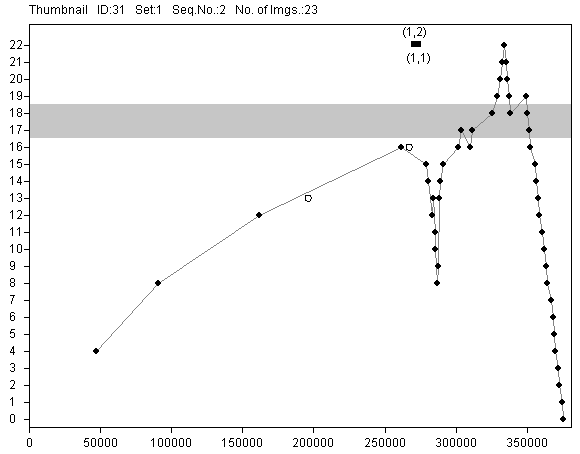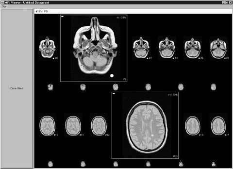Figure 1 shows a screen shot of our detail-in-context implementation. The images of one image sequence are displayed in the main display area according to our layout algorithm. Space between images remains black. A mouse click selects an image and causes it to be magnified. A second mouse click de-selects the image and returns it to its minimized state. Additional functions include a menu to specify the magnification factor for the selected images and a button labeled "Done/Next" to bring up the next image sequence. ![]() Figure 1. The detail-in-context implementation. A thumbnail technique was also implemented for the presentation of image sequences. This software is similar to the medical imaging package that we observed in use at a local hospital. Figure 2 shows a screen shot of our implementation. On the right hand side of the screen, a thumbnail bar shows small versions of the images in the sequence; for square images the thumbnails are each 80x80 pixels. Clicking on an image causes it to be displayed in the top left corner of the large display area. The large display area, which occupies most of the screen, shows a subset of the image sequence at high magnification factors. Only consecutive images are displayed in the large display area and the layout can be changed by pressing one of the buttons on the left hand side. Similar to the detail-in-context implementation, the "Done/Next" button loads the next image sequence. ![]() Figure 2. The thumbnail implementation. Both programs were written, compiled, and run with Sun Microsystem’s Java 1.2.2 to allow execution on other platforms. In our research, the software was run on a Pentium III 500MHz PC with a 21" monitor at a resolution of 1024×768 pixels. EMPIRICAL STUDY Overview and Setting We conducted an experiment that involved two conditions: detail-in-context and thumbnails. The experiment took place at Simon Fraser University, Canada, in April 2000. To gain a better understanding of how users interact with image sequences using the two display techniques, a combination of qualitative and quantitative analyses was performed on the data collected during the study. Participants Thirty-two university students from various disciplines participated in the study. It was decided not to involve radiologists for three main reasons. Only a limited number of MRI radiologists were available in the Greater Vancouver area. Due to their heavy workload, they were not able to spend sufficient time to take part in the study. Furthermore, the logistics of obtaining real patient data would have delayed our study significantly. Experimental Task Background The task in our study was modeled in part after the radiologists’ work. The following aspects of their work were maintained: