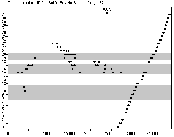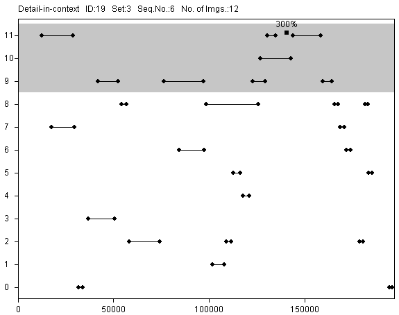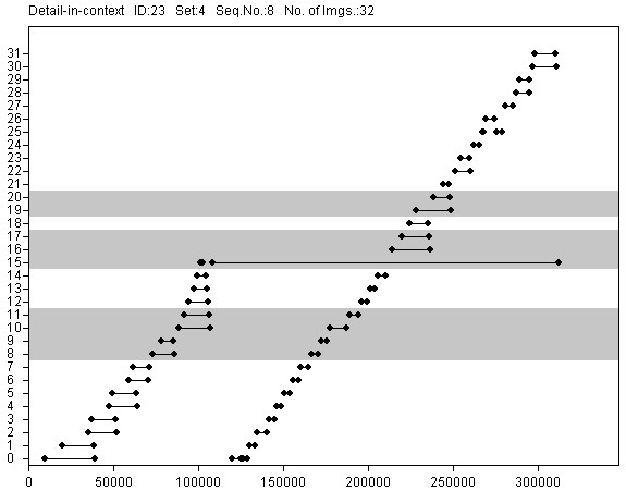 The participants were presented with two sets of image sequences, each set assigned to one condition. The experiment was a 2×2×2 (condition×set×gender) mixed design, with gender as the between subjects factor and condition and set as within subjects factors. All independent variables were counterbalanced, resulting in four condition×set groups with four females and four males in each group. Dependent Variables Nature of Interaction and Comments The focus of our study was to investigate the way users interact with the two display techniques. Recording the participants’ actions in a computer log allowed us to examine their behaviour in order to identify patterns, trends, and differences for each display technique. The information provided in the post-session questionnaire was used to collect feedback from the participants about each display technique. Performance and Preference We also performed statistical analyses on the participants’ performance and preference for a display technique to determine if any significant differences existed between the two techniques. RESULTS AND DISCUSSION Nature of Interaction and Comments Trial Charts In order to examine the way the participants interacted with the detail-in-context and the thumbnail technique, we visualized the computer log of each trial in a trial chart. Figure 4 shows a trial chart in the detail-in-context condition. Time (in milliseconds) is displayed on the horizontal axis and image numbers are displayed on the vertical axis. The left end of the trial chart denotes the beginning of a trial and the right end denotes the end of a trial. Gray bars indicate images that contain an anomaly. Solid dots represent mouse clicks on an image at a specific time. A horizontal line between two dots indicates the time during which an image was selected. Therefore, the dot to the left of that line represents a magnification event and the dot to the right represents a minimization event. Additional events such as magnification factor changes (100%, 150%, 200%, or 300%) are displayed in the top row of the trial chart. ![]() Figure 4. A trial chart in the detail-in-context condition (time in milliseconds on the horizontal axis, image numbers on the vertical axis). The trial charts in the thumbnail condition are similar, as shown in Figure 5. Solid dots represent mouse clicks on thumbnails. The lines between the dots indicate the order of the events. Layout changes in the large display area (1×1, 1×2, 2×1, 2×2, 3×3, and 3×4) are displayed in the top row of the trial chart. Additionally, empty dots represent clicks on images in the large display area (this did not have any effect on the software but was nonetheless recorded). ![]() Figure 5. A trial chart in the thumbnail condition (time in milliseconds on the horizontal axis, image numbers on the vertical axis). Examination Strategies All trial charts in the thumbnail condition reveal an interaction pattern similar to the one displayed in Figure 5. During the majority of time for a trial, images were examined in sequential order with a few iterations on images with an anomaly. Note that, as shown in Figure 5, the first few mouse clicks were made in steps of four because, by default, the large display area was set to a 2×2 layout. Sequential strategies were also observed in the detail-in-context condition. However, some participants selected images in a random order, as shown in Figure 6. In some instances, participants applied a mix of both strategies, typically consisting of an initial exploration phase and a final sequential check (see trial chart in Figure 7). ![]() Figure 6. Random selections in the detail-in-context condition. ![]() Figure 7. Final checks in the detail-in-context condition. In the post-session questionnaire, eight participants stated that it was easier to spot anomalies in the detail-in-context condition because it provided a global overview of the image sequence. Five participants mentioned that it was difficult to keep track of image numbers in the thumbnail condition because the thumbnail bar and the large display area were in two separate windows. The detail-in-context technique displayed all images on screen at all times during a trial. Thus, for an image sequence with 15 square images, each image occupies 130x130 pixels. As we observed, this facilitated the selection of images that immediately attracted the users’ attention. Some users examined images according to their current focus of attention while some applied a sequential strategy. The detail-in-context technique supported both. On the other hand, in the thumbnail technique, the thumbnails had a resolution of 80×80 pixels and, therefore, did not display sufficient detail to detect anomalies. Thus the thumbnail technique strongly encouraged the users to examine (by magnifying) small subsets of images at a time, selecting them in sequential order. Image Comparisons Some participants in the detail-in-context condition did not make any comparisons between multiple magnified images. Figure 4 shows such a trial. Other participants frequently made comparisons, magnifying typically three, sometimes up to six images at a time. In some cases, one image was kept magnified as a reference while the remaining images were compared to that reference. In the trial shown in Figure 8, image #15, which contained an anomaly, was magnified for a period of approximately three minutes, while the participant selected all other images for magnification. ![]() Figure 8. Comparisons in the detail-in-context condition. The comment most frequently made in the post-session questionnaire (by thirteen participants) was appreciation of the fact that with the detail-in-context technique, random combinations of images could be picked for comparison. Images that were not adjacent, e.g. image #2 and #14, could be magnified, whereas with the thumbnail technique, only images in close proximity could be magnified at the same time. Skipping of 