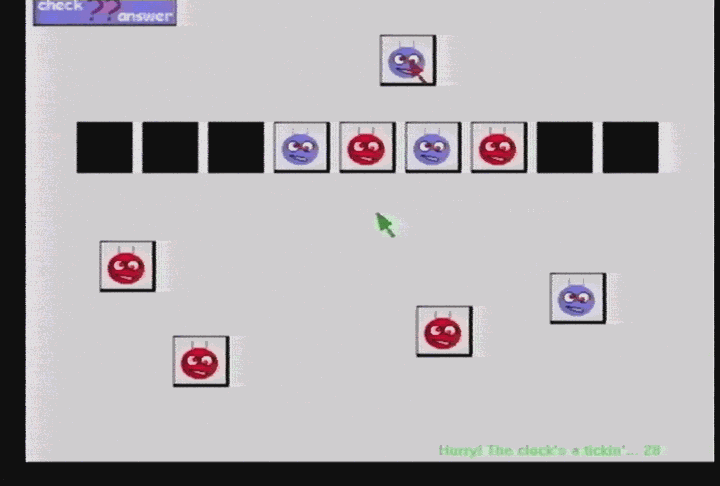 Figure 1. Sample puzzle screen from the computer version of the Alien Pattern game. The paper-based version of the game was played on a 14" X 8" sheet of laminated paper (see Figure 2). The alien faces were mounted on 1" X 1" magnets to make them easy to handle. The alien faces were moved into place by physically positioning them on the paper. To check a solution, the players were required to ask a researcher whether or not it was correct. If the pattern was incorrect, the researcher asked the children to keep trying. If the pattern was correct, the researcher provided the children with the next puzzle in the game.
