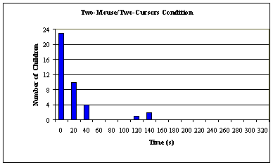* p<.01DiscussionThe results of this study demonstrate that providing children with support for their collaborative interactions can positively impact their levels of engagement, activity, and motivation. In an educational environment, minimizing the amount of off-task behaviour is extremely important. Our results strongly indicate that one way to help ensure children are engaged in a computer-based learning activity is to provide multiple children the ability to interact with the environment simultaneously. Having control of a mouse and a cursor was important to the children in our study. As one of the children mentioned, when there is only one mouse, "somebody that doesn’t play as much as the other person might not think it was fair because of being left out". Others expressed that it was easier to solve the puzzles with two mice because they could work in parallel and did not have to take turns. It was interesting to note that when the children played the paper-based version of the game, off-task behaviours were very infrequent. This could be attributed to the fact that each child could easily interact with the game, and that the children always played the paper-based version first (i.e. early in the session) while the game was still a novelty. Because of the significant interaction effect of collaborative conditions and the assigned order of those conditions it is important to examine the individual effects independently. When children were presented with the one-mouse/one-cursor condition first, the children were less active, possibly because their participation was hindered by limited access to the mouse. Then, when these same children played in their follow-up session, their level of activity rose significantly, even higher than those pairs that started with the two-mouse/two-cursors condition. It seems as if being constrained initially caused the children to take full advantage of their ability to interact simultaneously, later on. Children, who instead played the two-mouse/two-cursors condition first, on average, exhibited higher levels of activity in their follow-up one-mouse/one-cursor condition than those children who started with that condition. In this case, once both children were comfortable working simultaneously, this behaviour may have continued in the one-mouse/one-cursor condition, resulting in higher activity levels. This is an important result because being constrained to existing computer technology may limit the potential for higher levels of cooperative activity. Children who participated in this study seemed to thoroughly enjoy working together on a computer with multiple mice. This may be attributed to its novelty, however many children are already familiar with these interaction paradigms from video game playing experience and tend to express a preference for multi-player video games (Inkpen et al., 1994; Lawry et al., 1995). Figure 6 demonstrates children’s enthusiasm for playing with friends on the computer.
