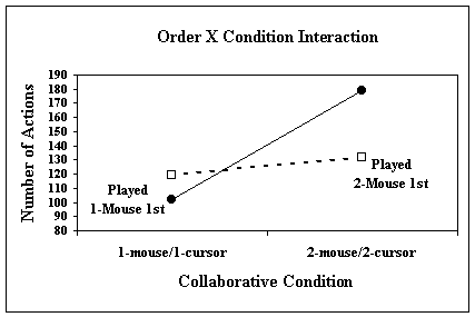 Level of activityThe number of object placements and "check-answer" button clicks were recorded to investigate the level of activity for each child in the two computer-based conditions. A mixed ANOVA was performed, with collaborative condition as the within-subjects variable and gender, order of condition, and order of puzzle set as the between-subjects variables. Results revealed a statistically significant interaction effect between the collaborative condition and which condition the children played first as shown in Figure 5. A comparison of the simple main effects revealed that children who played using the one-mouse/one-cursor condition first, had a significant increase in their activity level when they played using the two-mouse/two-cursors setup in their follow-up session, F(1,17)=59.147, p<.001, with a power of 100%. In contrast, children who played using the two-mouse/two-cursors condition first, displayed no significant change in their activity level when they played in the follow-up one-mouse/one-cursor condition, F(1,21)=1.414, ns, with a power of 20%.