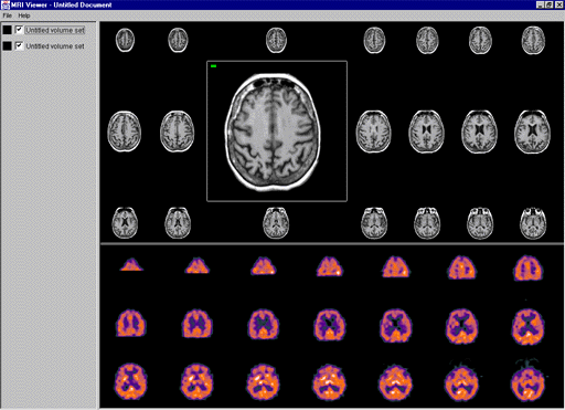 Figure 1. Screenshot of the MRI viewer Presentation of Volume Sets The MRI viewer allows for the display of one or more volume sets. Volume sets are loaded into memory and selected for display. The program lists the currently loaded volume sets and whether or not they are currently visible. When more than one volume set is selected for display they are stacked vertically. A thin bar separates the different volume sets. The bar can be dragged up or down to provide more space for a volume set. Fish-Eye Visualization In order to provide both detailed and contextual information, we chose a fish-eye visualization technique that preserves orthogonality without distorting the images [2]. When the mouse pointer is moved over an image, a dark gray bounding box appears to indicate which image will be manipulated. Clicking the image magnifies it. Scans that are not magnified shrink to at least 30 x 30 pixels. Magnified scans try to attain their full resolution. A green box in the corner of an image indicates that it has reached full size. A red box means the image is smaller than that. Removal of White Space In response to the radiologists’ comments from the preliminary study, the background color was chosen to be black. This should help reduce the distraction previously noted using the white background. Nonetheless, functions were included to create user-defined background colors if desired. Extensibility The software was implemented using Java and object-oriented techniques to provide for easy extensibility and platform independence. New image layout techniques are easily plugged into the program by deriving from the class that manages the display. This also applies to other display objects, for example, to integrate annotated images. Data Collection All classes contain three data collection functions: Log, Error, and Record. These functions are used to trace user actions during a user study. Messages sent to these functions are pipelined to the Java applet where they can be saved in a file. FUTURE WORK As this is the first version of the MRI viewer, it is clear that the program is still in a growing and maturing phase. There are several potential extensions that will be considered.